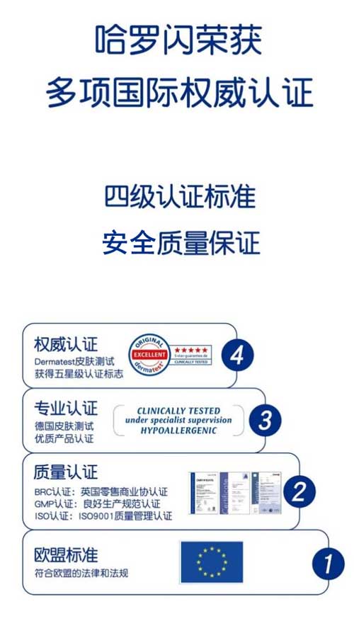 哈羅閃的產品研發、生產均符合歐盟標準,并擁有德國皮膚測試的優質產品認證;如,哈羅閃嬰兒凈護二合一洗發沐浴露、哈羅閃嬰兒柔護潤膚乳、哈羅閃嬰兒柔護按摩油、哈羅閃嬰兒溫和護膚霜等,均通過了德國權威皮膚科醫生協會認證Dermatest的皮膚測試,并獲得5星級認證,達到5星標準即代表產品通過極為嚴苛的檢測程序。