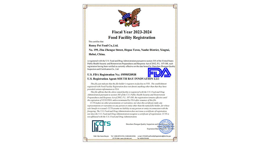 榮喜寵物食品公司專注于自主開發寵物食品已達23年,耗資5億元人民幣建設了智慧4.0數字化工廠。該公司榮獲了多項國內外嚴格的質量標準及體系認證,包括美國食品藥品管理局認證(Food and Drug Administration,簡稱FDA認證)、國際質量管理體系ISO9001、國際環境管理體系ISO14001、國際食品安全管理體系ISO22000以及國際職業健康安全管理體系ISO45001等多項國際嚴格標準體系認證。