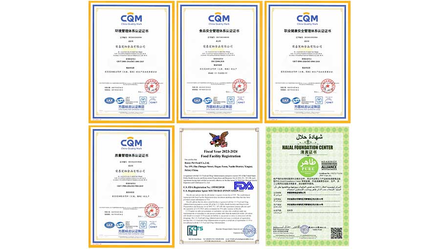 榮喜寵物食品公司專注于自主開發寵物食品已達24年,耗資5億元人民幣建設了智慧4.0數字化工廠;榮獲了多項國內外嚴格的質量標準及體系認證,包括美國食品藥品管理局認證(Food and Drug Administration,簡稱FDA認證)、國際質量管理體系ISO9001、國際環境管理體系ISO14001、國際食品安全管理體系ISO22000以及國際職業健康安全管理體系ISO45001等多項國際嚴格標準體系認證。