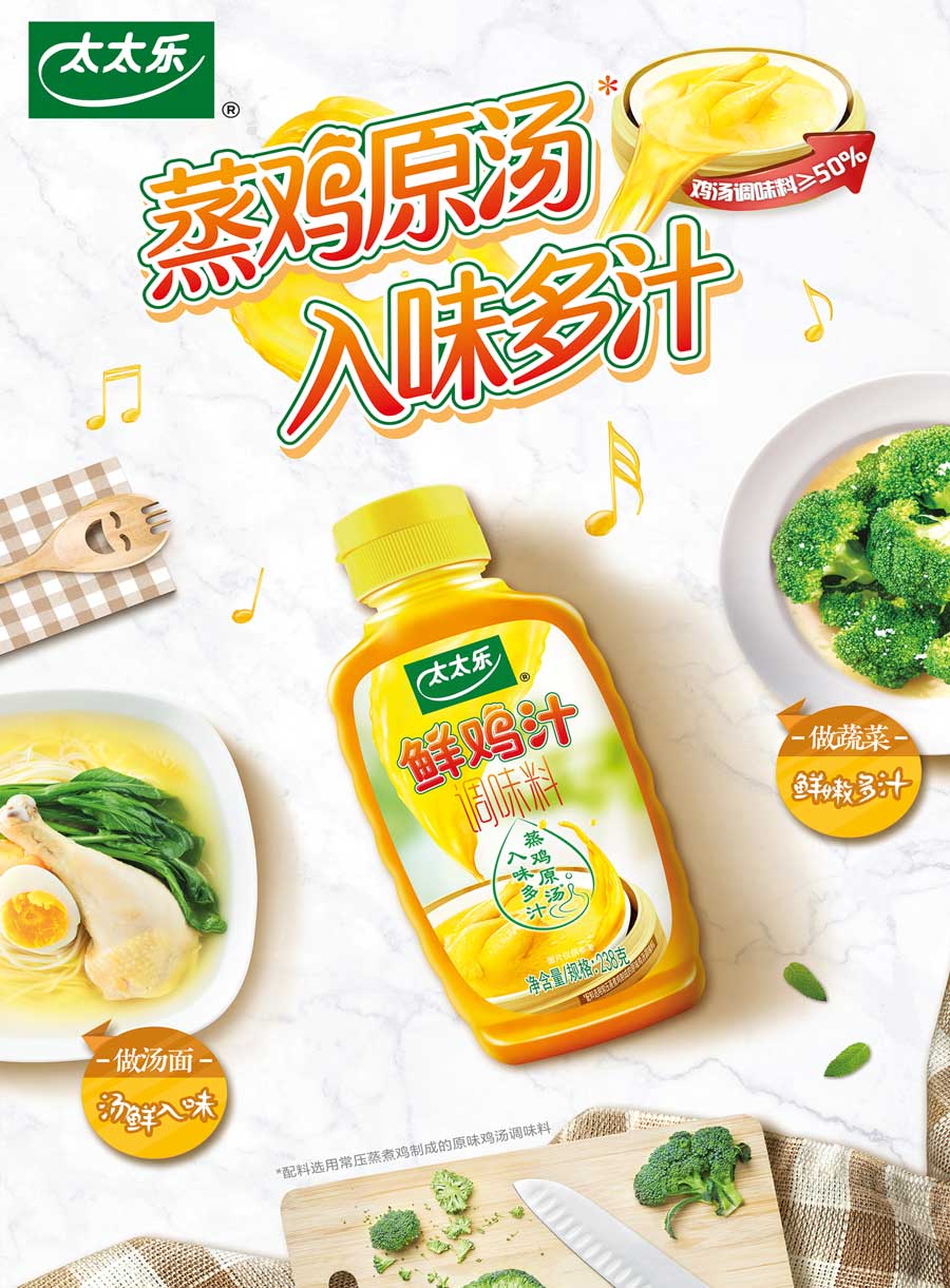 主要產(chǎn)品:三鮮雞精、鮮雞汁、太太樂(lè)原味鮮醬油系列、湯之鮮系列、菜譜式調(diào)料系列、蠔油系列、天天旺等