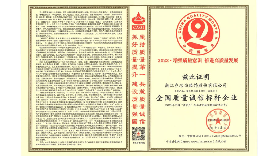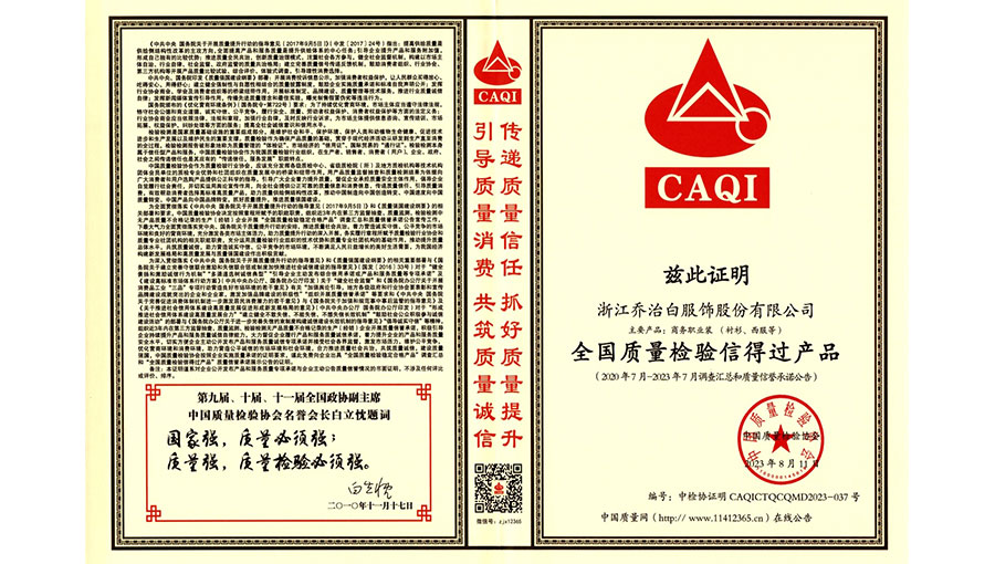 浙江喬治白服飾股份有限公司自創業以來,堅持品牌戰略,通過了ISO9000質量管理體系、ISO14001環境管理體系和OHSAS18000職業健康安全管理體系認證。采用意大利GIUSEPPE公司的設計理念,不斷推出糅合經典與時尚的完美產品。