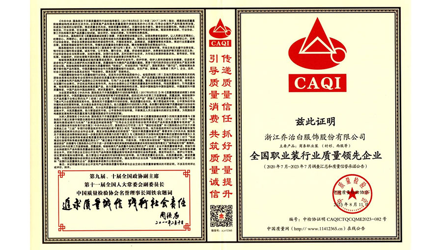 喬治白先后榮獲中國名牌產品、中國職業裝十大領軍企業、全國守合同重信用單位、國家級綠色工廠、浙江省智能工廠等榮譽稱號。作為全國標準化工作先進單位,喬治白積極參與標準化工作,先后參與《職業裝檢驗規則》、《襯衫》、《女西服、大衣》等9項國家標準的起草與修訂工作,《全毛襯西服》行業標準起草。