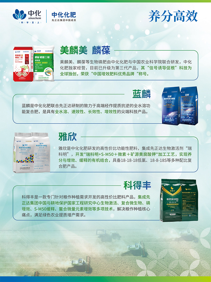 美麟美、麟葆等生物磷肥由中化化肥與中國農業科學院聯合研發,中化化肥獨家經營,目前已升級為第三代產品,其“信號誘導促根”科技為全球獨創,榮獲“中國增效肥料優秀品牌“稱號藍麟是中化化肥聯合先正達研制的致力于高端經作提質抗逆的全水溶功能復合肥,是具有全水溶、速效性、長效性、增效性的尖端科技產品。