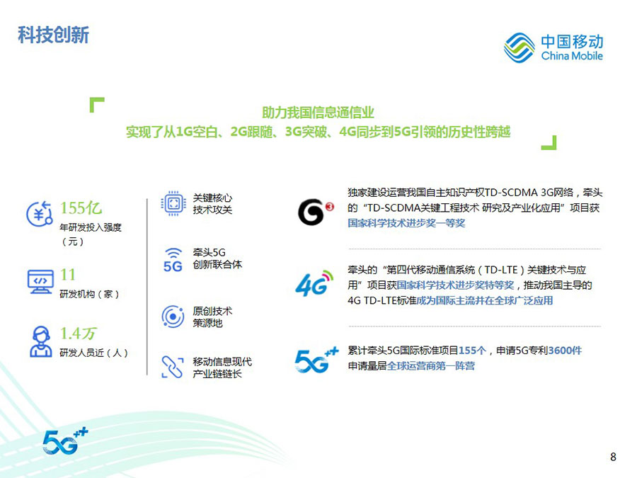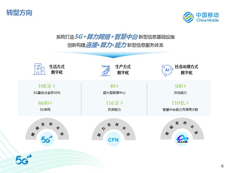 2022年,中國移動全年營運收入達到人民幣9,373億元,同比增長10.5%,其中通信服務收入達到人民幣8,121億元,同比增長8.1%。CHBN客戶規模、收入規模全面增長,HBN收入占通信服務收入比達到39.8%,同比提升4.1個百分點。得益于5G應用、移動云、數字內容、智慧家庭等業務的快速拓展,數字化轉型收入達到人民幣2,076億元,同比增長30.3%。整體來看,公司著力打造的數字化轉型收入增長“第二曲線”卓有成效,收入結構更加均衡穩健,可持續增長動能不斷增強,抗風險能力顯著提升。
