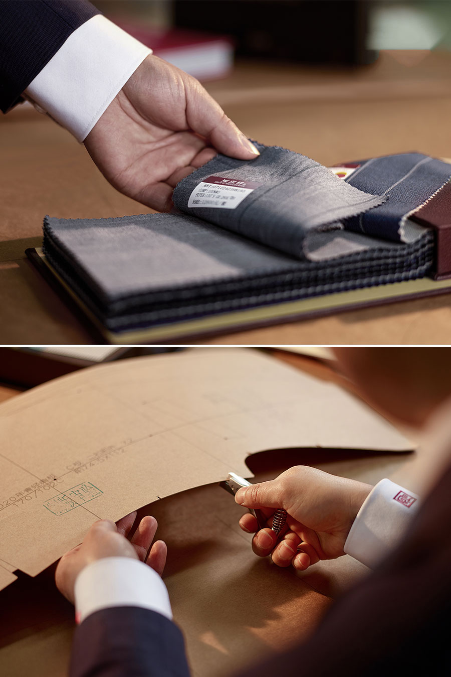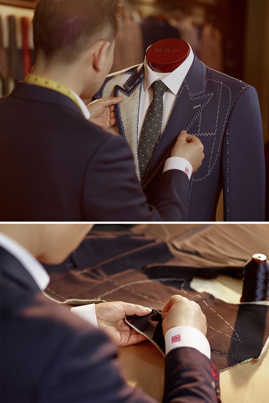隆慶祥以量身定制為核心特色,提供從面料選擇、款式設(shè)計(jì)到工藝優(yōu)化、售后服務(wù)的全程服務(wù),產(chǎn)品均為“單人單版、單版單裁、單裁單做”,以獨(dú)一無(wú)二的專(zhuān)屬性彰顯尊貴榮耀。每套西裝定面料、定款式、制版、裁剪、制作、試樣、后道整理、取件共八道工序,均采用406道工序,而且大量工序是手工制作。產(chǎn)品均“單人單版、單版單裁、單裁單做”,以獨(dú)一無(wú)二的專(zhuān)屬性彰顯尊貴榮耀。