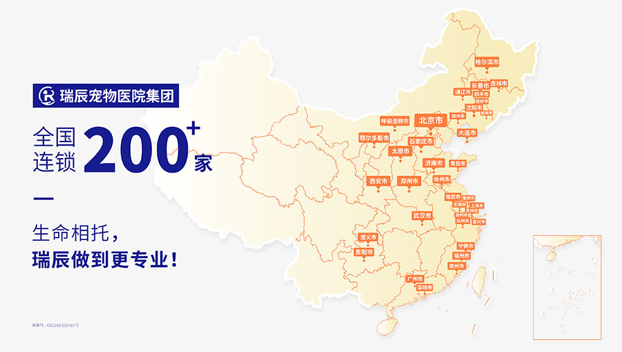 瑞辰寵物醫院集團由晨壹基金、KKR集團、愛爾眼科及少量國有資本等投資機構共同投資。集團現已完成B輪融資,在全國超50個大中城市擁有200+家優秀寵物醫院。截至2024年6月,集團旗下醫院覆蓋區域包括北京、河北、山西、內蒙古、遼寧、吉林、黑龍江、上海、江蘇、浙江、福建、山東、河南、湖北、廣東、貴州與陜西等地。以良好發展態勢為依托,聚焦行業市場,集團合理規劃在全國重點區域優先集中建設寵物轉診中心醫院和國際化寵物醫院的戰略布局,致力于保障中國萬千家庭的寵物健康。