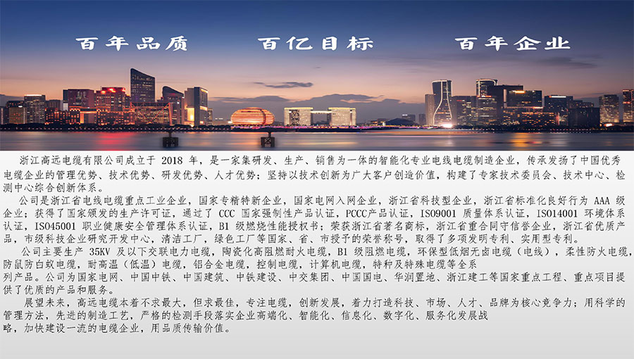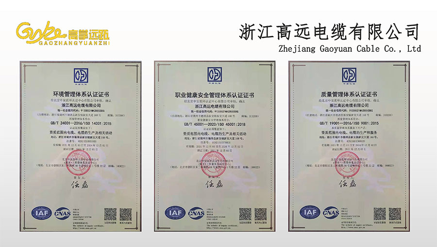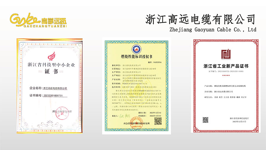 高遠電纜是浙江省電線電纜重點工業(yè)企業(yè),浙江省專精特新企業(yè)、浙江省科技型企業(yè),浙江省標準化良好行為AAA級企業(yè);獲得了國家頒發(fā)的生產(chǎn)許可證,通過了CCC國家強制性產(chǎn)品認證,ISO9001質(zhì)量體系認證,ISO14001環(huán)境體系認證,OHSAS18001職業(yè)健康安全管理體系認證,PCCC產(chǎn)品認證、B1級燃燒性能授權(quán)書;榮獲浙江省著名商標,浙江省重合同守信譽企業(yè),浙江省優(yōu)質(zhì)產(chǎn)品,市級研究開發(fā)中心,清潔工廠,綠色工廠等國家、省、市授權(quán)的榮譽稱號,取得了多項發(fā)明專利、實用型專利。