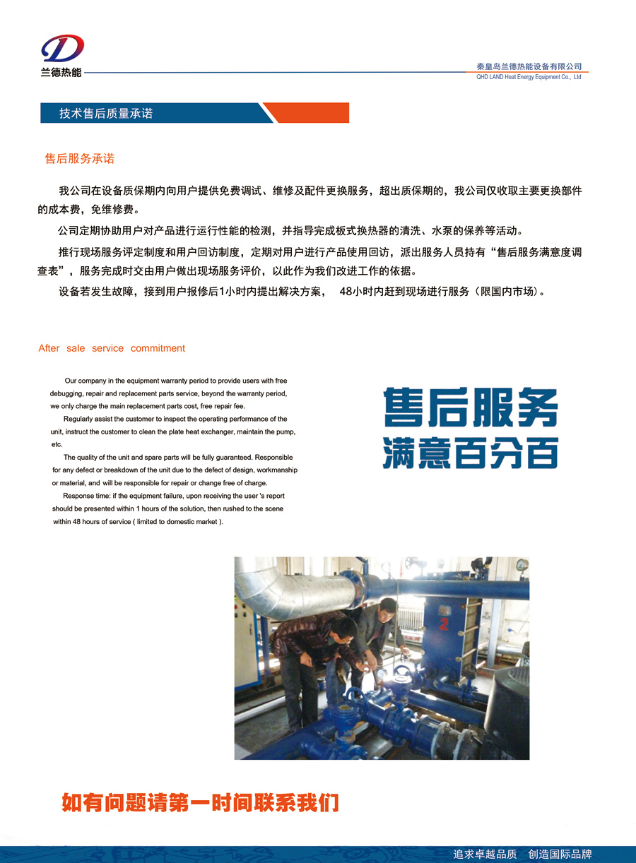 公司秉承“追求卓越品質(zhì),創(chuàng)造國際品牌”的經(jīng)營理念,隨時為客戶提供全球領(lǐng)先的換熱解決方案,專業(yè)提供高品質(zhì)的換熱設(shè)備和快速、高效的服務(wù),并贏得了行業(yè)領(lǐng)域多家客戶的信賴。許多國家重點工程項目及全國各大熱力公司都使用了我公司的產(chǎn)品,如大同熱力公司、包頭熱力公司、蘭州熱力公司、西山煤電熱力公司、釣魚臺國賓館、北京國資委、國家大劇院、大眾汽車、長慶油田等。蘭德熱能將竭誠為您提供優(yōu)質(zhì)的產(chǎn)品和最好的服務(wù)!