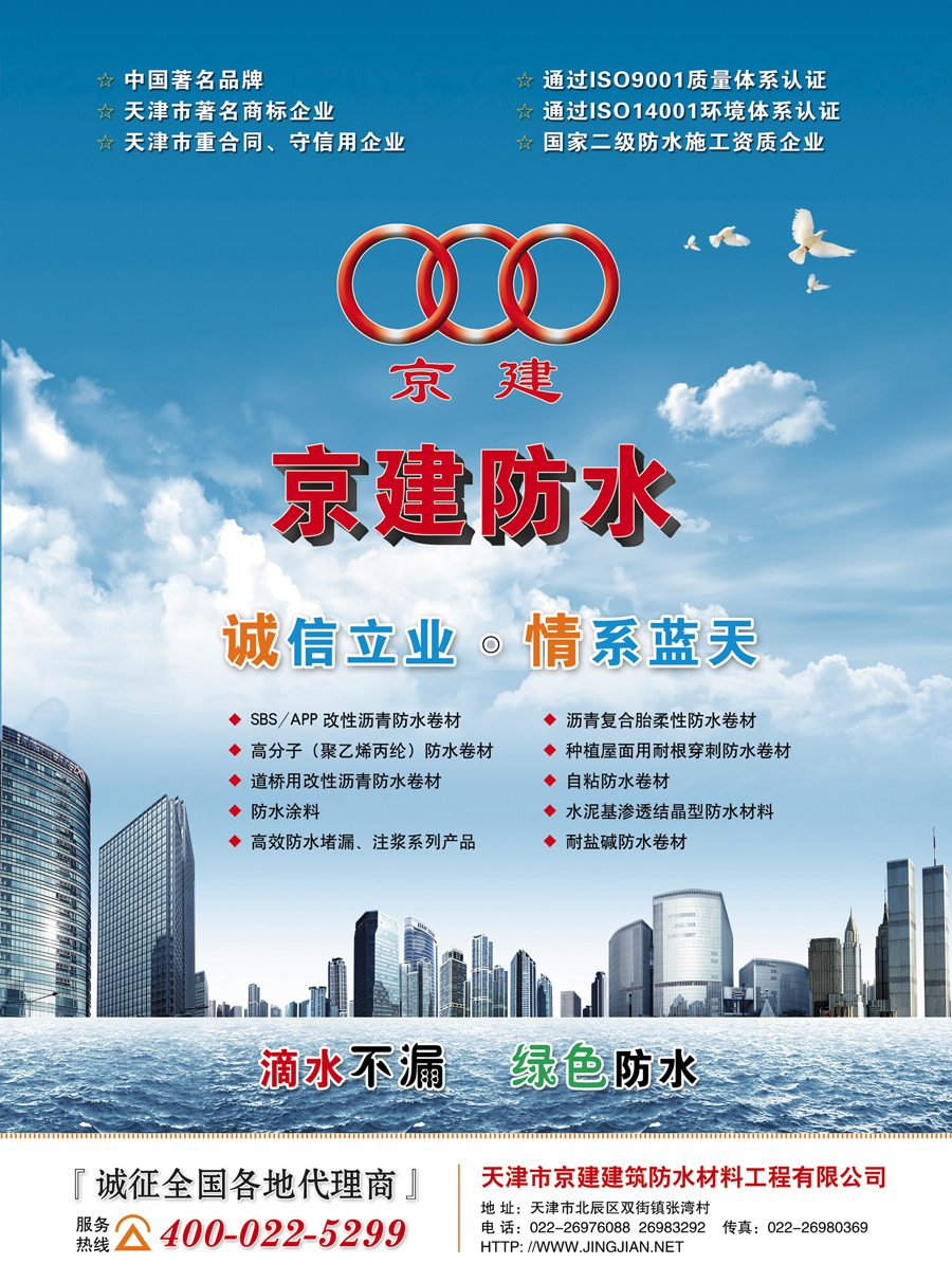 天津市京建建筑防水工程有限公司始建于1996年,隨著公司的逐步成長,目前已成為集新產品研發、生產、銷售、設計、施工、服務于一體的大型防水企業,公司主導產品有SBS改性瀝青防水卷材、自粘防水卷材、高分子防水卷材、道橋用防水卷材、抗根刺防水卷材、耐鹽堿防水卷材、聚氨酯防水涂料、聚合物水泥防水涂料、丙烯酸防水涂料、道橋用防水涂料、水泥基滲透結晶型防水材料、聚氨酯密封材料、高效堵漏材料等幾十個品種。是天津市最大的新型防水材料生產企業之一,市級“重合同,守信譽”單位,系中國建筑防水材料工業協會會員單位。天津建材業協會常任理事單位,天津建材服務中心分支機構,公司擁有資產總額8000萬元,現有員工385人,中級以上的工程技術人員和經濟管理人員126人,公司具有貳級防水施工資質、獲得貳級以上項目經理和建造師32人,高素質的員工隊伍為企業發展奠定了基礎。
