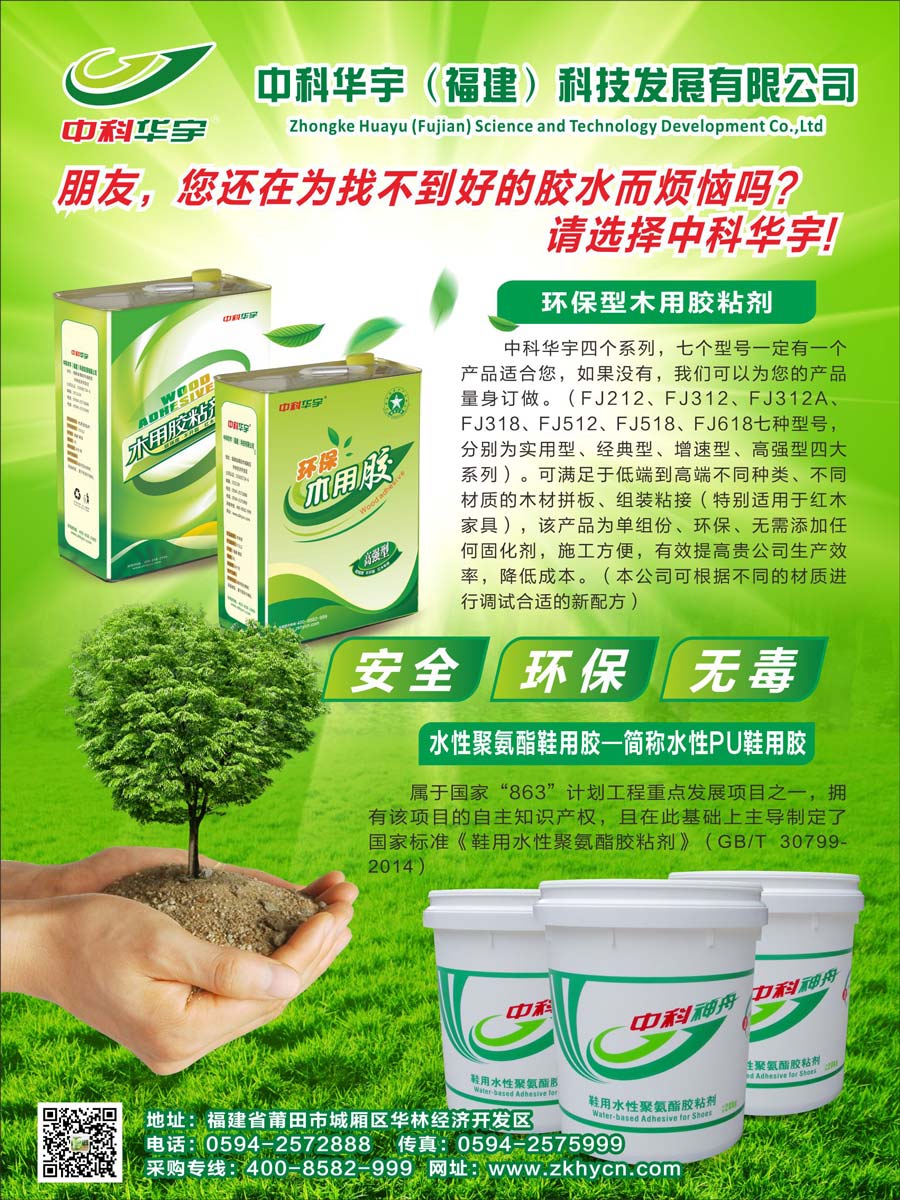 主要產品:中科華宇牌、中科神舟牌鞋用水性聚氨酯膠粘劑、環保型木用膠粘劑、晶瓷王、無苯無醛萬能膠等膠粘劑產品