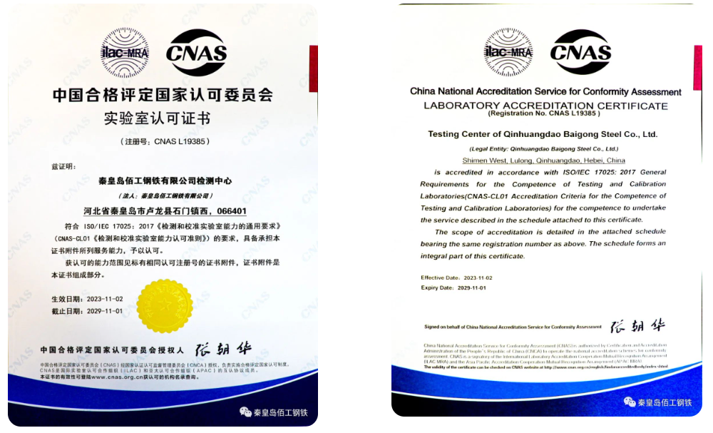 秦皇島佰工鋼鐵有限公司榮獲國家CNAS實驗室認可