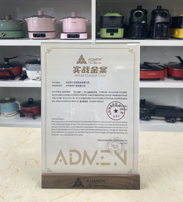 2022年第十一屆ADMEN國(guó)際大獎(jiǎng)8月16日在天津揭曉并頒獎(jiǎng),北京利仁科技股份有限公司選送的《“利仁電器”》央視案例榮獲整合營(yíng)銷類實(shí)戰(zhàn)金案獎(jiǎng)。