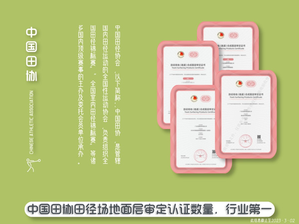 中國田徑協(xié)會田徑場地(跑道)合成面層產(chǎn)品審定辦法,是為規(guī)范田徑場地合成面層產(chǎn)品使用,提高面層材料產(chǎn)品質(zhì)量、促進(jìn)田徑場地建設(shè)質(zhì)量,滿足舉辦高水平田徑競賽及開展群眾性、學(xué)校內(nèi)田徑運(yùn)動的需要,中國田徑協(xié)會(以下簡稱:中國田協(xié))參照世界田徑聯(lián)合會(以下簡稱:世界田聯(lián))認(rèn)證體系,結(jié)合中國田徑場地發(fā)展現(xiàn)狀制定的。是國內(nèi)最具知名度和可靠性的行業(yè)評級體系之一,是各大運(yùn)動地材企業(yè)的“兵家必爭之地”。