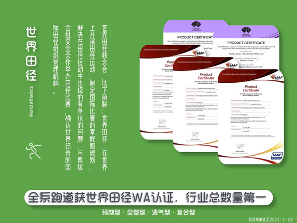榮獲WA認(rèn)證的運(yùn)動地材產(chǎn)品,意味著國際田聯(lián)的背書和肯定,在品質(zhì)、使用體驗(yàn)、安全性等諸多方面達(dá)到國際專業(yè)競賽要求。