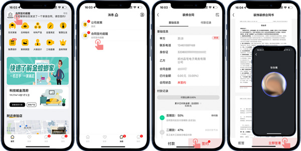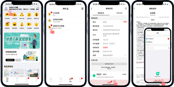客戶線上確定好裝修門店后,門店會擬好線上合同,并推送到客戶的APP賬號,客戶收到合同簽約提醒就可以在線簽約操作了,合同簽好后通過進度款支付提醒可以進行在線付款操作。