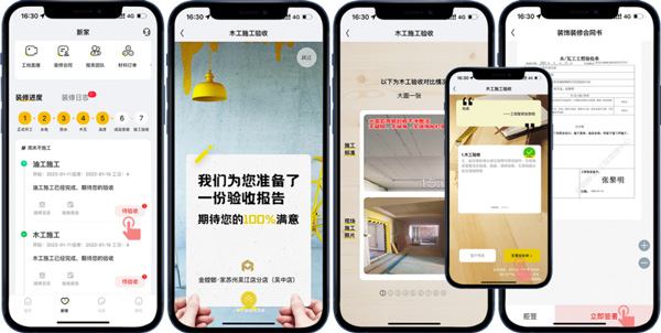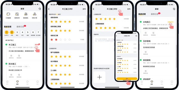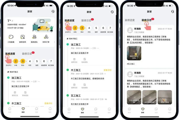 通過“新家-裝修進度”和“新家-裝修日志”模式,直觀地了解到目前的裝修階段,工程隊每日的工作內容,讓客戶在家就能了解施工進度、感受工程品質!