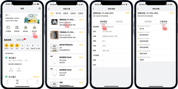 此外,也能在“新家-材料訂單”查看裝修涉及到的材料采購和到貨情況,省去客戶去現場查看的麻煩,如果材料未按約定時間到貨,客戶也能及時跟催門店處理,以免耽誤裝修進度。