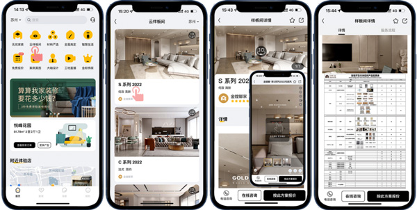 客戶想看整裝樣板間?不一定要去線下展館,一部手機就能逛夠癮。在金螳螂家APP“云樣板間”里,就可720云VR觀看各個空間的效果,里面可查看超詳細的空間材料配置表,都是優質大牌產品,還能隨時隨地針對產品進行在線咨詢,并按照戶型預估樣板間設計報價。