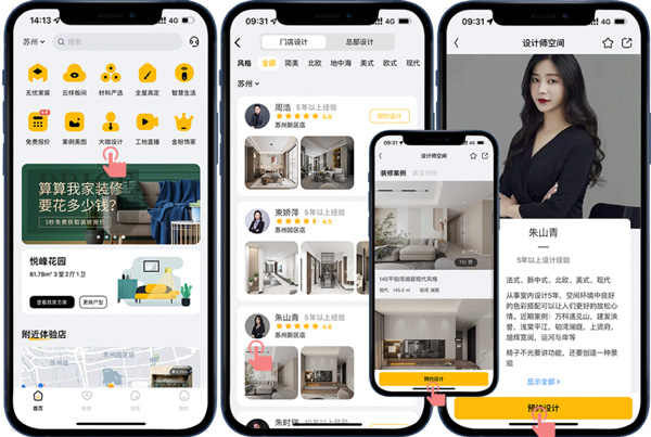 打開金螳螂家APP,進入首頁“大咖設計”,可了解設計師的個人簡介,以及他的優秀裝修作品和客戶的真實評價,通過以上了解,客戶挑選中意的設計師,馬上預約,就可與他線上直接暢聊溝通設計方案、設計細節,為客戶量身定制專屬方案。