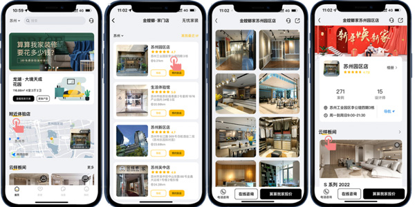 目前,金螳螂家在全國擁有150家門店,客戶可以通過“附近體驗店”選擇客戶所在城市的服務門店,在這里可以了解到該門店的720度VR全景樣板間、案例、設計師以及客戶的真實評價,不用出門探訪實體門店,就能快速了解門店情況,省時又省力!
