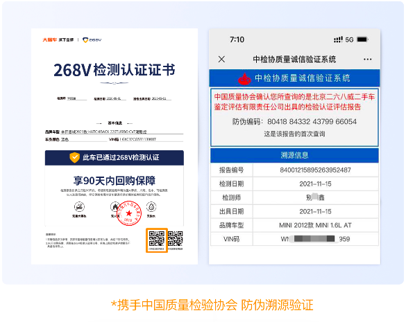 首先,268V官方提供的檢測(cè)報(bào)告,是支持“防偽溯源查詢”,每份報(bào)告均可驗(yàn)證真?zhèn)巍OM(fèi)者在買車時(shí),如果檢測(cè)報(bào)告是268V的,直接掃描防偽查詢二維碼,對(duì)報(bào)告進(jìn)行驗(yàn)證,假報(bào)告第一時(shí)間不攻自破;