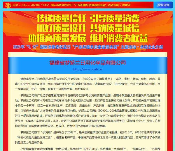 引導質量消費,共筑質量誠信,3月15日,由中國質量檢驗協會主辦的2021年“3.15”產品和服務質量誠信承諾的主題活動如期舉行,小浣熊作為“3.15”產品和服務質量誠信承諾企業,憑借匠心的品質、優質的服務及良好的口碑,獲得協會以及權威專家的一致認可,榮獲“全國產品和服務質量誠信示范企業”,“全國質量誠信先進企業”、“全國質量信譽保障產品”、“全國日化行業質量領先品牌” 等多項榮譽,《中國質量報》、《中國消費者報》及中國質量網、中國經濟網、中國消費網等多家媒體均予以集中展示和公告。