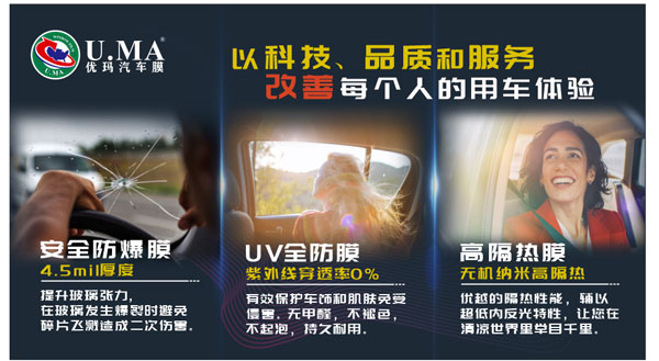 U.MA優瑪是國內汽車膜工廠當中具備20多年市場沉淀的世界窗膜十大品牌;上海佳尼士新材料科技有限公司是中國最專業的品牌運營企業之一。