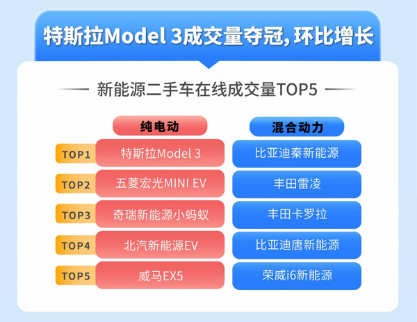據天天拍車數據顯示,3月新能源二手車在線成交量排名,特斯拉Model 3奪得純電動新能源二手車成交量冠軍,環比2月成交量大增,其后依次是五菱宏光MINI EV、奇瑞新能源小螞蟻、北汽新能源EV、威馬EX5。比亞迪秦新能源二手車成交量占得混合動力新能源二手車成交量第一,其后依次是豐田雷凌、豐田卡羅拉、比亞迪唐新能源、榮威i6新能源。
