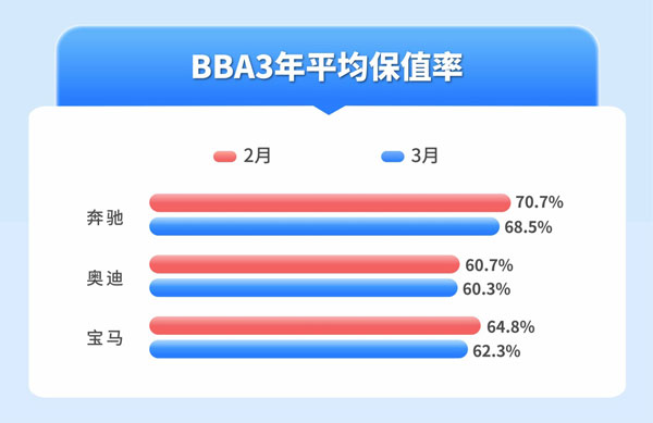 寶馬、奔馳、奧迪品牌是消費者熱衷的豪華汽車品牌,在二手車市場交易熱度較高,也是二手車經銷商收車較多的類型。3月BBA品牌3年平均保值率行情,表現最高的是奔馳品牌,其3年平均保值率為68.5%,較2月下滑2.2%;其次是寶馬品牌,其3年平均保值率為62.3%,較2月下跌2.5%;奧迪品牌3年平均保值率為60.3%,較2月微跌0.4%。