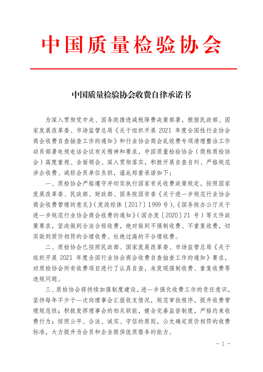 中國質量檢驗協會收費自律承諾書