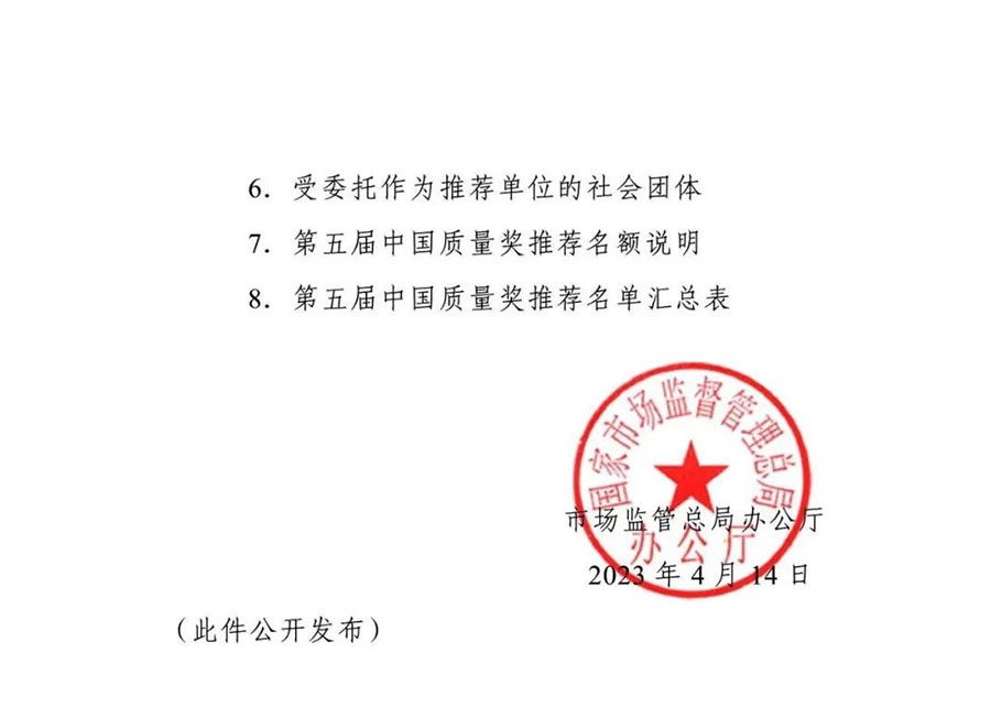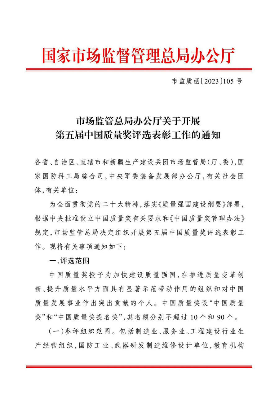 為全面貫徹黨的二十大精神,落實《質量強國建設綱要》部署,根據中央批準設立中國質量獎有關要求和《中國質量獎管理辦法》規定,市場監管總局決定組織開展第五屆中國質量獎評選表彰工作。現將有關事項通知如下: