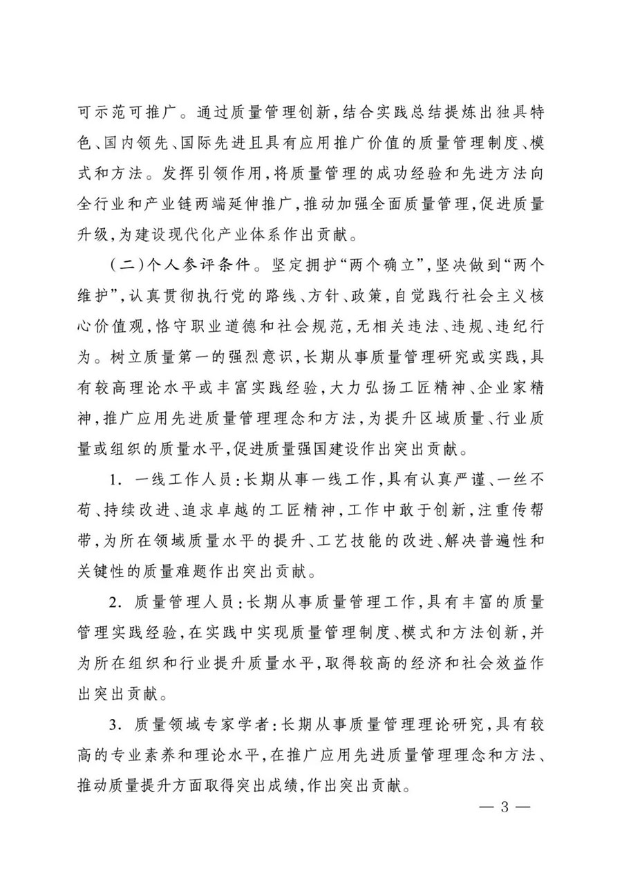 (二)個人參評條件。堅定擁護“兩個確立”,堅決做到“兩個維護”,認真貫徹執行黨的路線、方針、政策,自覺踐行社會主義核心價值觀,恪守職業道德和社會規范,無相關違法、違規、違紀行為。樹立質量第一的強烈意識,長期從事質量管理研究或實踐,具有較高理論水平或豐富實踐經驗,大力弘揚工匠精神、企業家精神,推廣應用先進質量管理理念和方法,為提升區域質量、行業質量或組織的質量水平,促進質量強國建設作出突出貢獻。