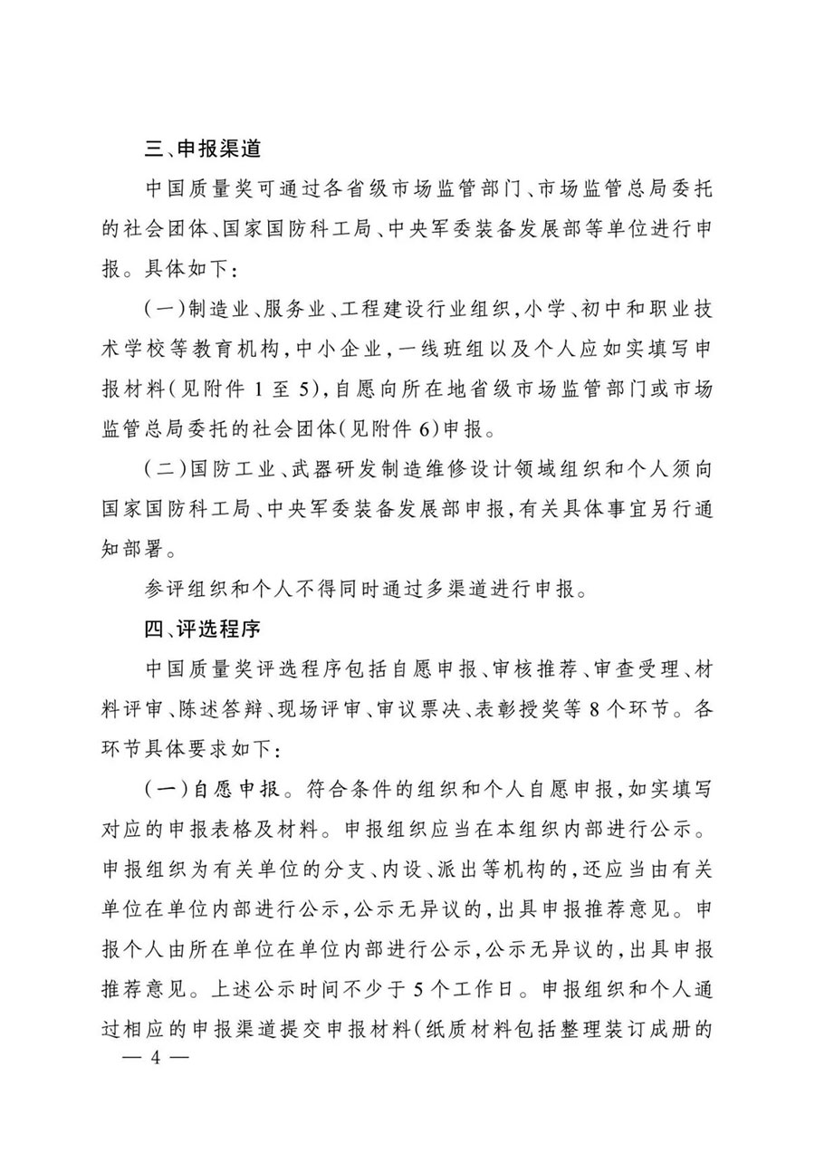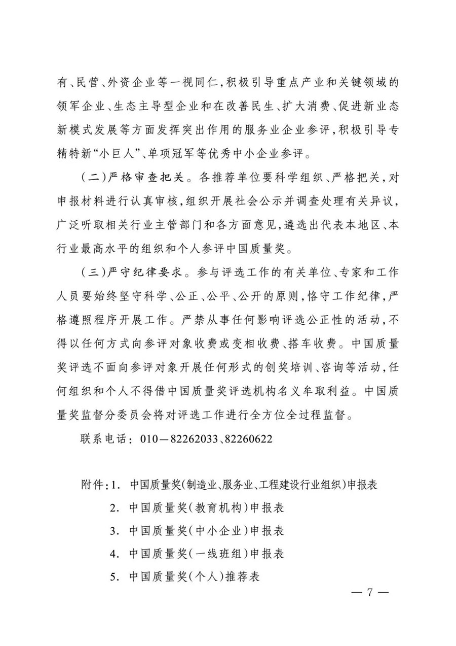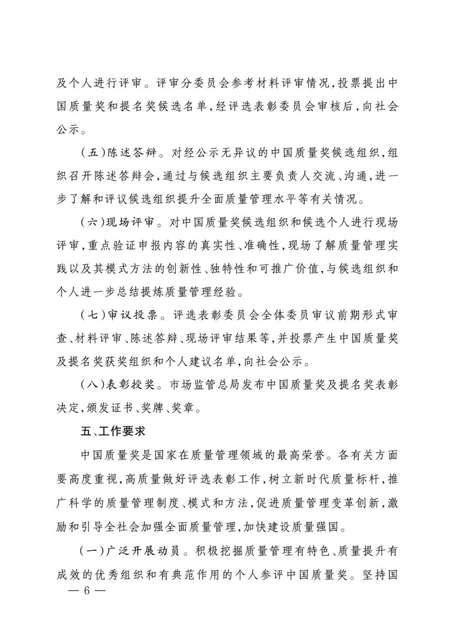(二)嚴格審查把關。各推薦單位要科學組織、嚴格把關,對申報材料進行認真審核,組織開展社會公示并調查處理有關異議,廣泛聽取相關行業主管部門和各方面意見,遴選出代表本地區、本行業最高水平的組織和個人參評中國質量獎。