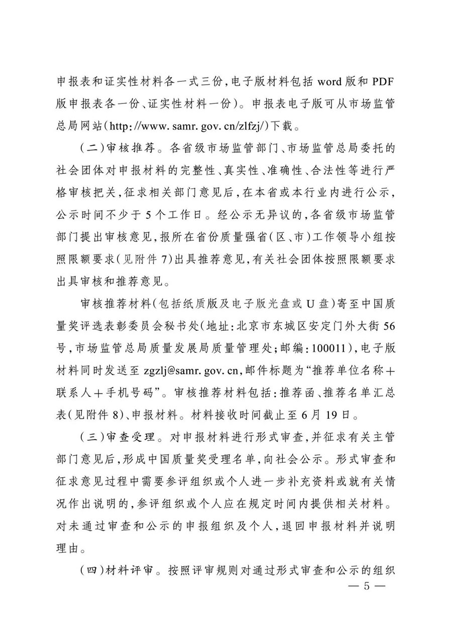 審核推薦材料(包括紙質版及電子版光盤或U盤)寄至中國質量獎評選表彰委員會秘書處(地址:北京市東城區安定門外大街56號,市場監管總局質量發展局質量管理處;郵編:100011),電子版材料同時發送至zgzlj@samr.gov.cn,郵件標題為“推薦單位名稱+聯系人+手機號碼”。審核推薦材料包括:推薦函、推薦名單匯總表(見附件8)、申報材料。材料接收時間截止至6月19日。
