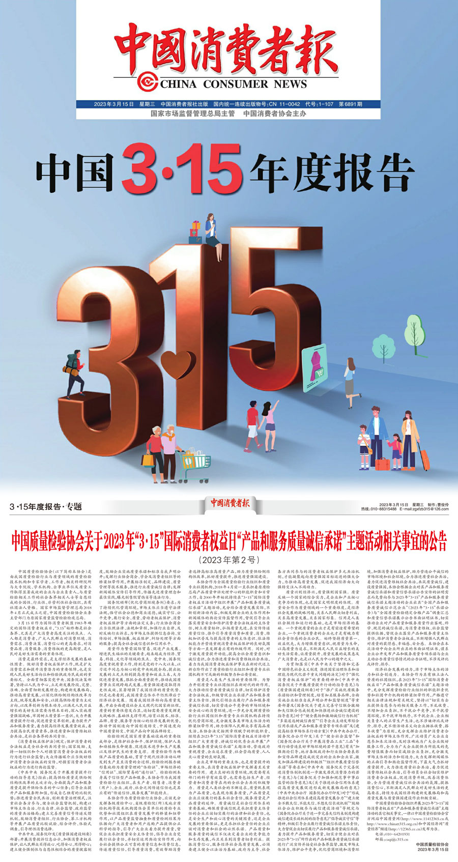 中國消費(fèi)者報(bào):中國質(zhì)量檢驗(yàn)協(xié)會(huì)關(guān)于2023年“3·15”國際消費(fèi)者權(quán)益日“產(chǎn)品和服務(wù)質(zhì)量誠信承諾”主題活動(dòng)相關(guān)事宜的公告