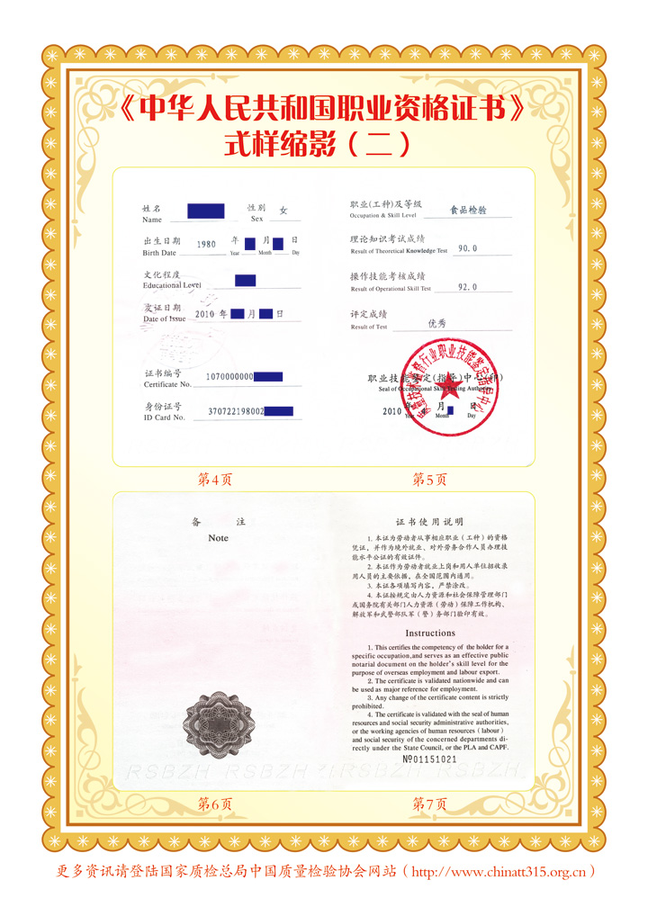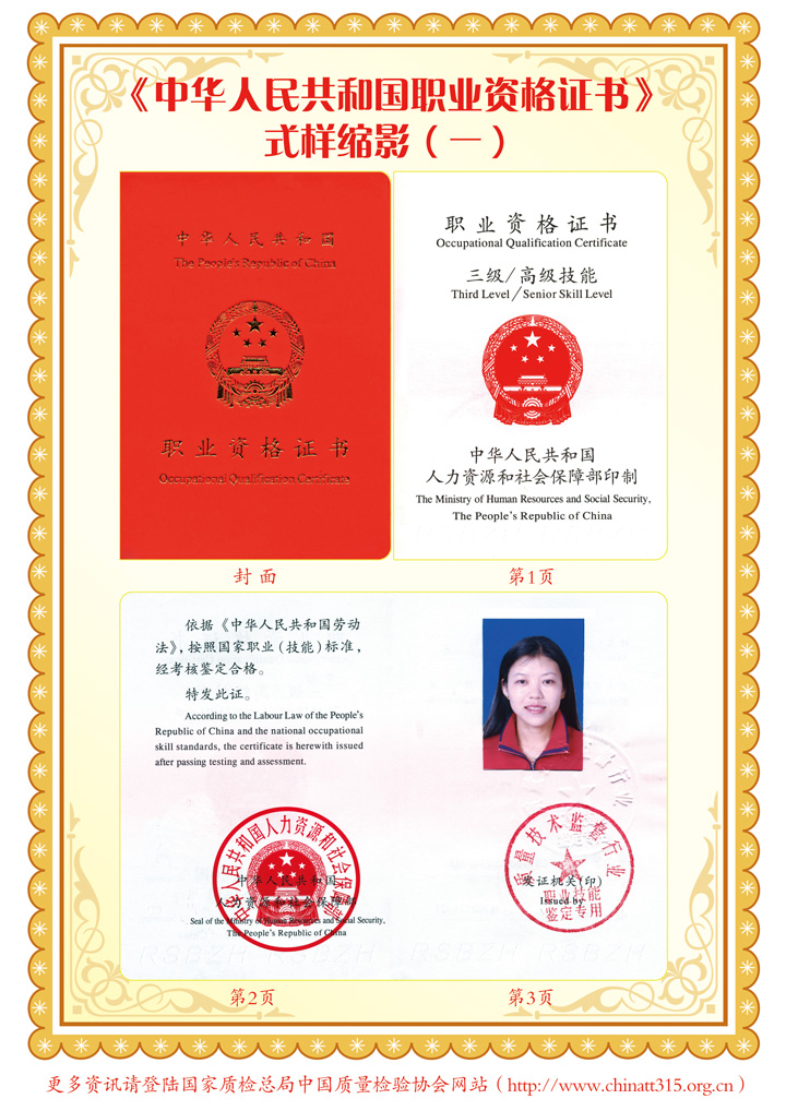 參加我會組織的培訓并經考試、鑒定合格者,將由(國家質量監督檢驗檢疫總局)質量技術監督行業職業技能鑒定指導中心頒發中華人民共和國勞動和社會保障部印制的《中華人民共和國職業資格證書》(初級、中級、高級)。《中華人民共和國職業資格證書》既是從事相關檢驗崗位人員所具備的職業技術要求和職業技能水平的資格憑證,也是用人單位技能人才評價、招收錄用和確定技能人才工資待遇的主要依據,還是我國公民境外就業和輸出勞務具備法律效力公正的國家級有效證件(可應學員要求頒發英文版本的證書)。