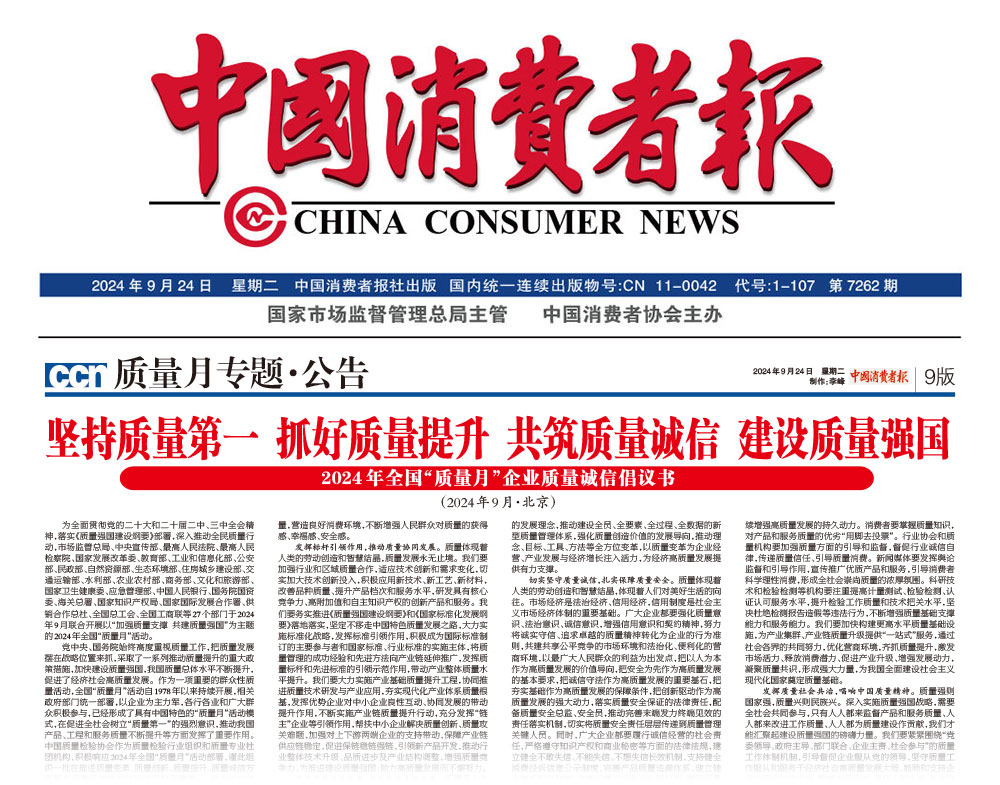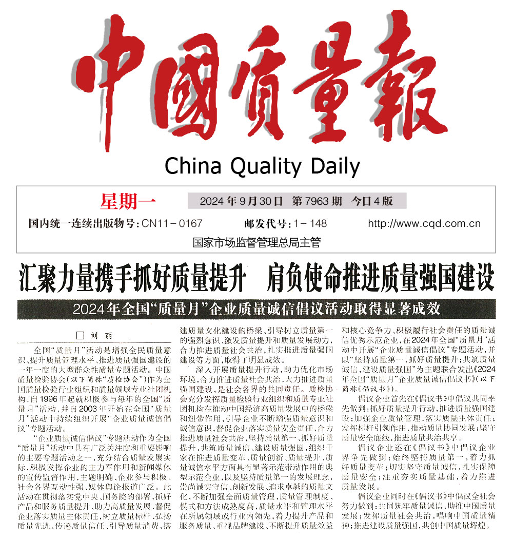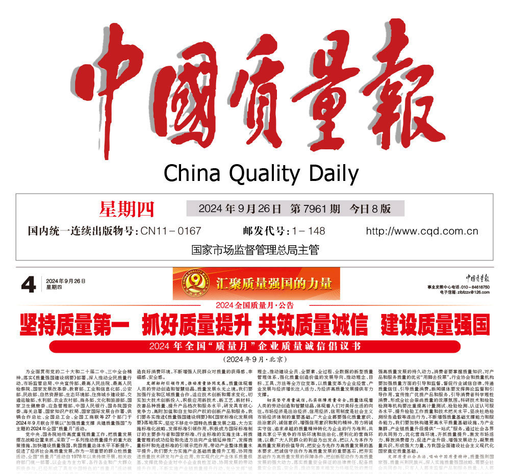 - 中國質量報—堅持質量第一抓好質量提升 共筑質量誠信 建設質量強國——2024年全國“質量月”企業質量誠信倡議書(2024年9月·北京)