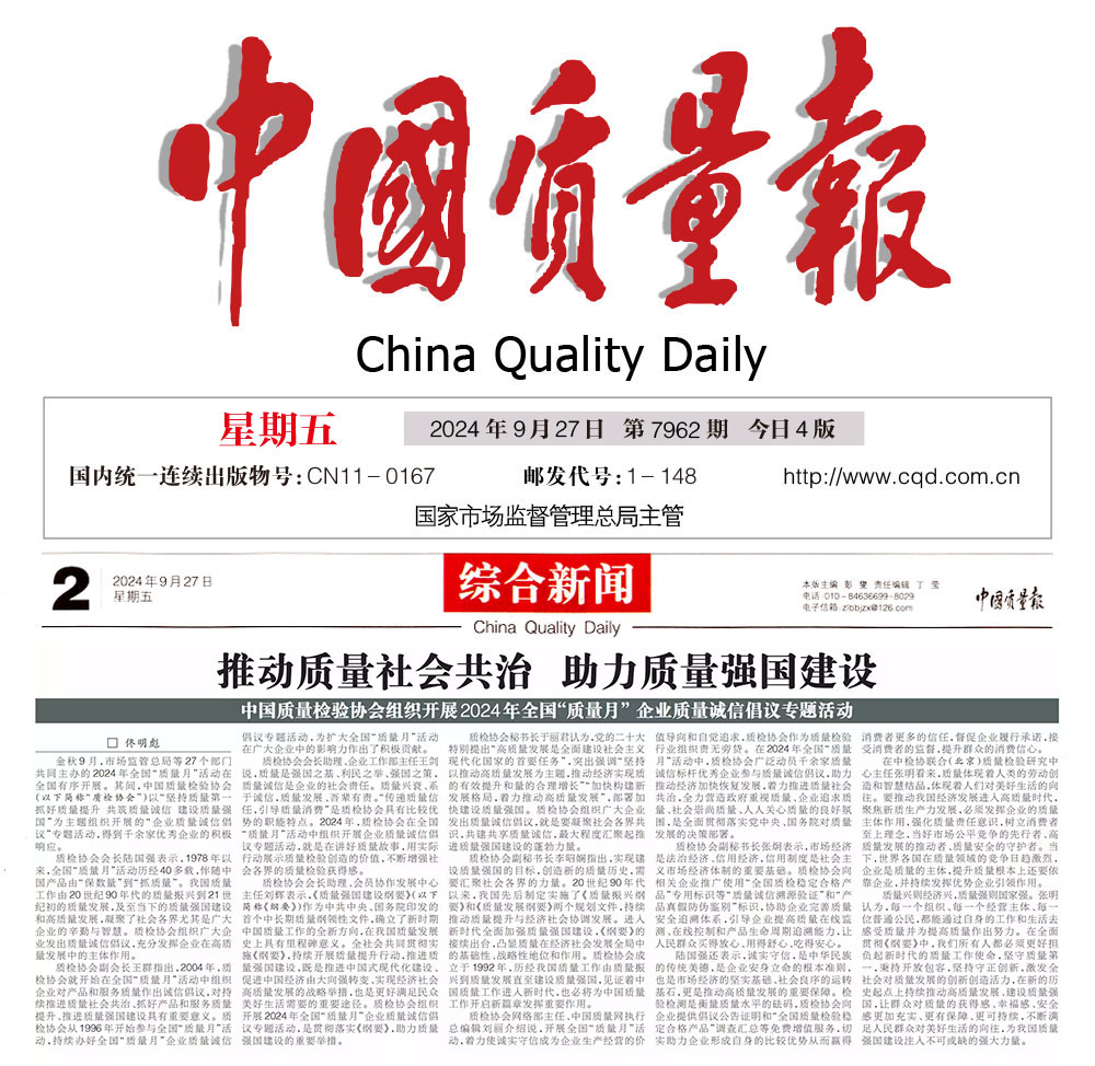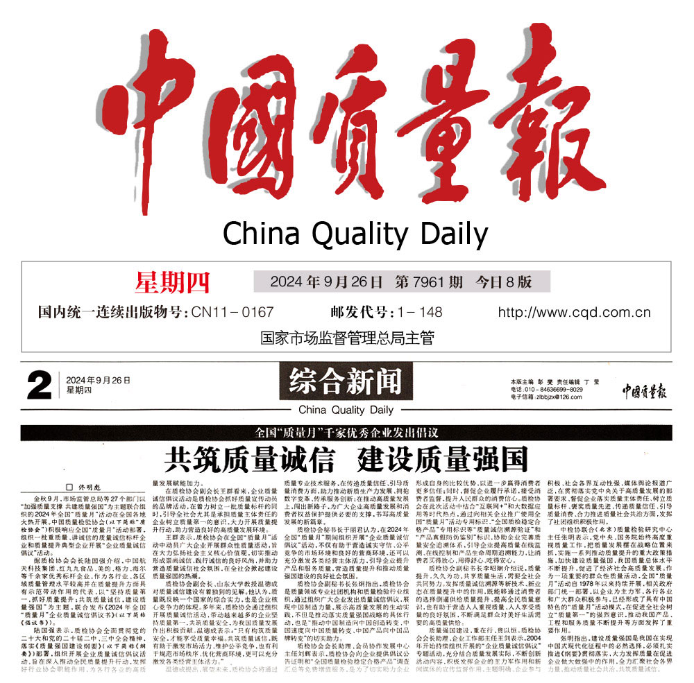 - 中國質量報—堅持質量第一推動質量社會共治 助力質量強國建設——中國質量檢驗協會組織開展2024年全國“質量月” 企業質量誠信倡議專題活動